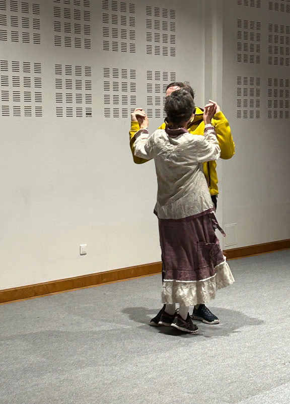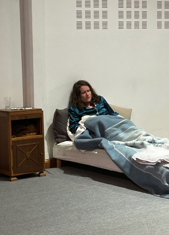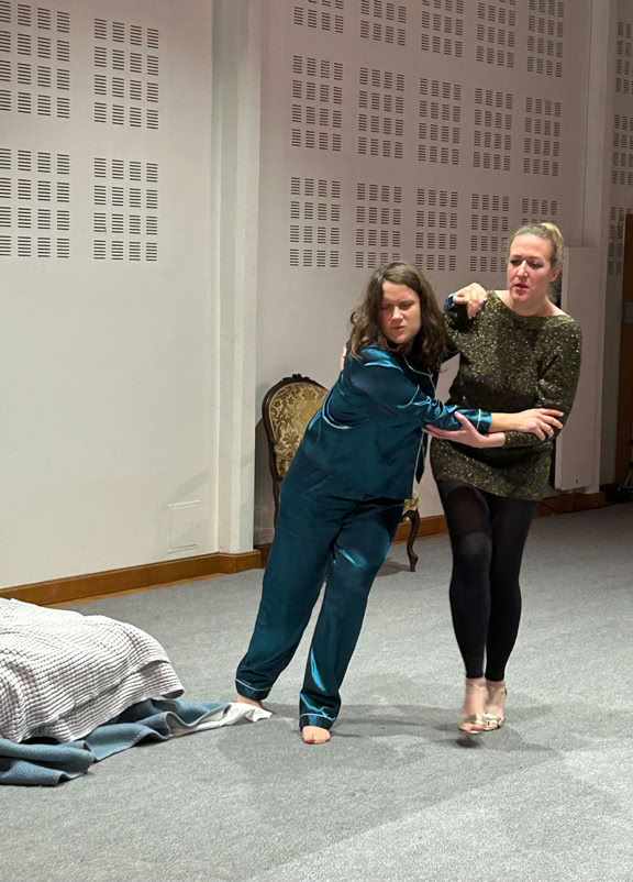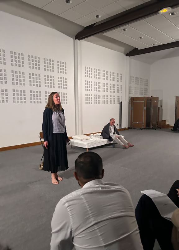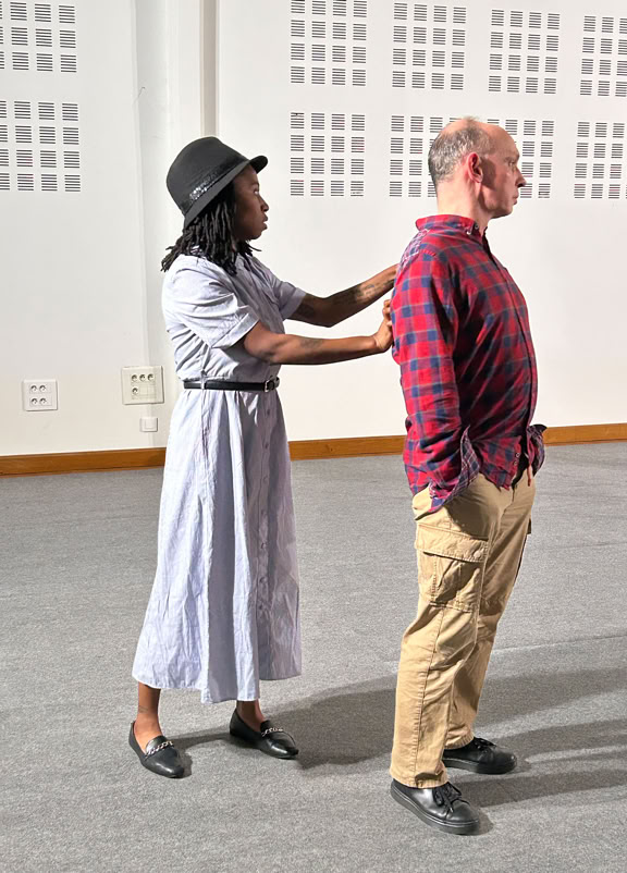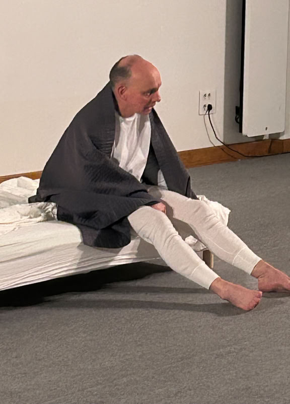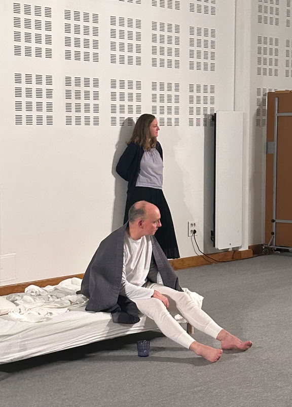 La pièce est construite sous la forme de deux soliloques juxtaposés, à peine ponctués par la parole de l’un ou de l’autre. Leurs âmes sont distantes, leurs sentiments meurtris, leurs corps dissociés, disloqués.