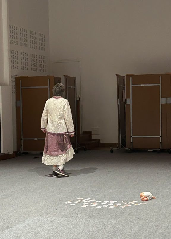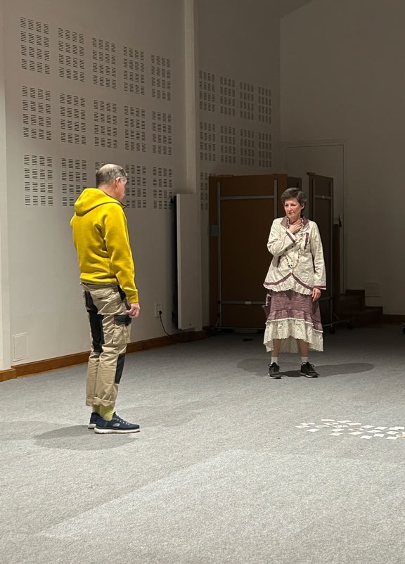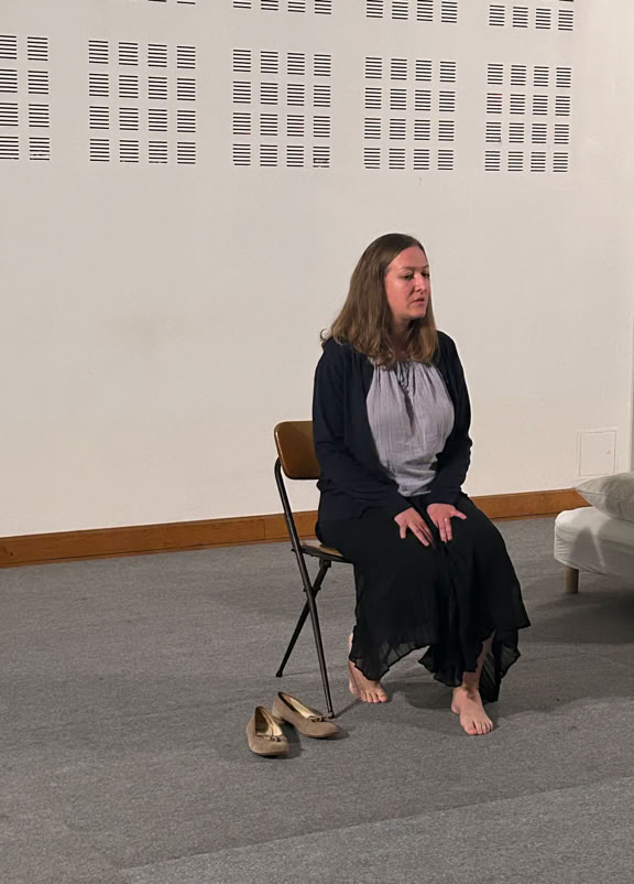 La pièce est construite sous la forme de deux soliloques juxtaposés, à peine ponctués par la parole de l’un ou de l’autre. Leurs âmes sont distantes, leurs sentiments meurtris, leurs corps dissociés, disloqués.
